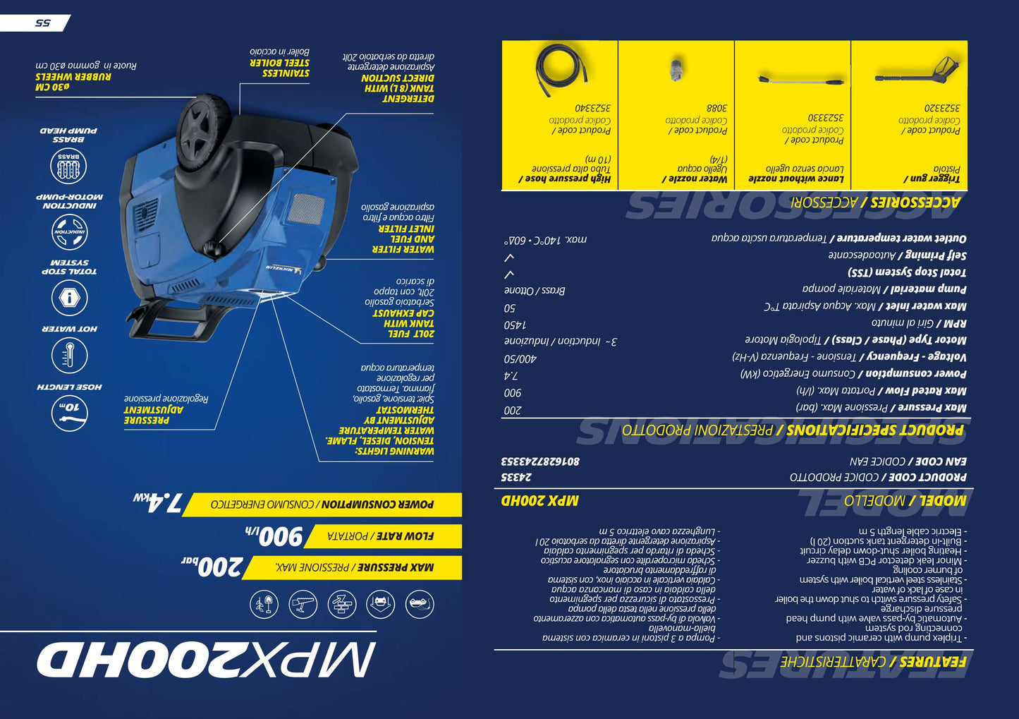 MICHELIN High Pressure Washer, Hot Water, 200 Bar, 7.4 KW 3 Ph Motor, Suitable for Heavy Duty Applications