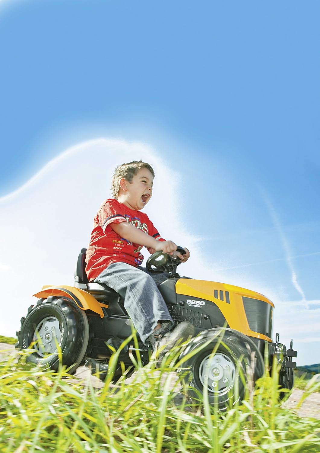 This extra large chain driven JCB 8250 V-Tronic licensed tractor features anti-slip pedals, opening bonnet, front and rear hitch pins, rugged wheels and an adjustable seat. Suit ages 3+.