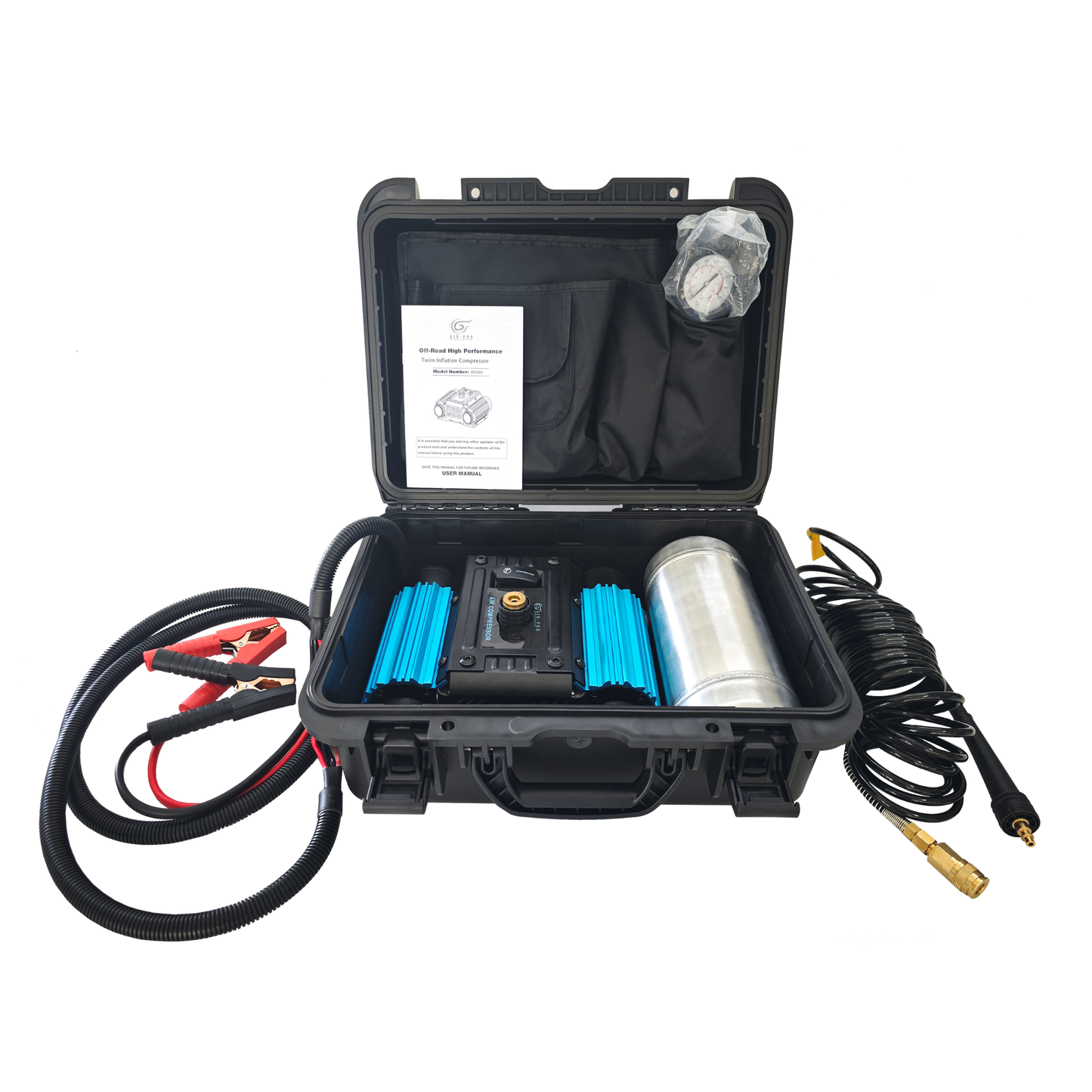 The AIR-PRO Heavy Duty Twin Motor Air Compressor is built for drivers who demand serious performance, whether you're inflating large 4x4 tires after off-roading or powering air tools in remote locations. Featuring a dual-cylinder design and a 150 PSI integrated air tank, this compressor delivers rapid, consistent air flow for demanding tasks. Housed in a durable waterproof case with a 20-foot hose and essential accessories, it’s ready for any job—on or off the road. Rugged, reliable, and portable, the AIR-PRO is the ultimate inflation solution for cars, SUVs, trucks, and more.